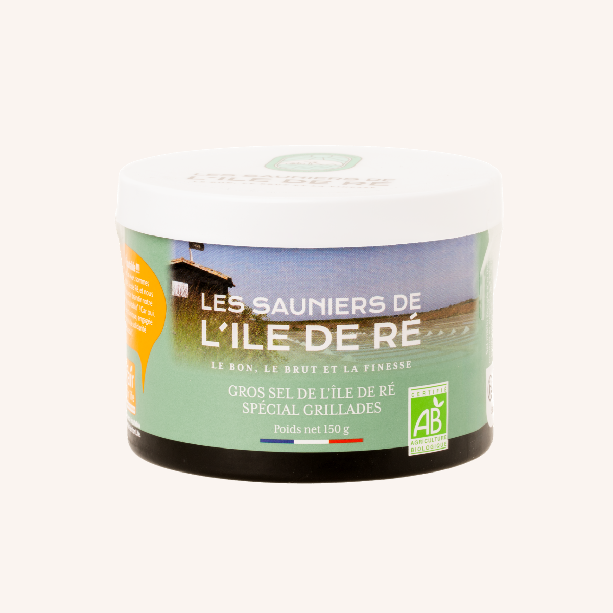| Compositions | 85% sel marin gris alimentaire, 15% Aromates BIO à proportions variables (poivres*, thym*, romarin*, piment d'Espelette AOP* (2.5%), paprika*, basilic*, marjolaine*, sariette*, huile de tournesol*, extrait de romarin*). Le Gros sel marin gris de l'ile de Ré est récolté de façon traditionnelle et manuellement dans les marais salants de l'ile de Ré. Le sel marin gris alimentaire n'est pas obtenu à partir d'OGM et ne contient pas d'OGM. Aucun traitement d'ionisation n'est effectuée. Aucune étape de raffinage n'est effectuée. |